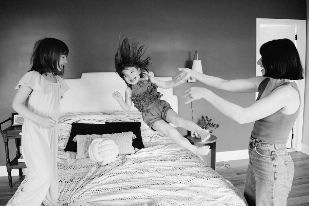At some point, the energy shifted upstairs, where the bed turned into a full wrestling match. It was the kind that moves quickly between laughter, someone yelling “stop,” and then right back again. The siblings were in their most honest form.